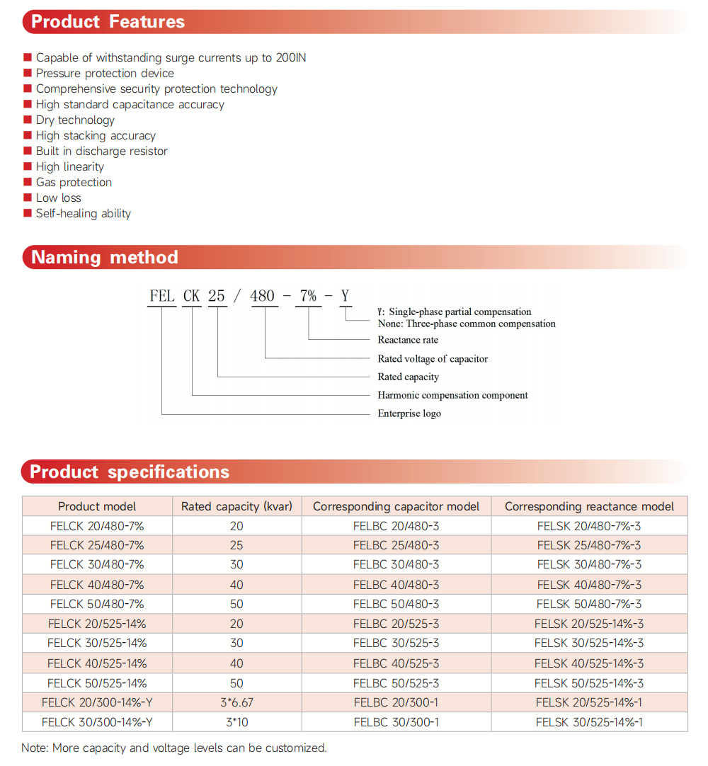 • FELCK filtering component is a compensation unit that combines capacitors and reactors according to load conditions, and has reactive power compensation and harmonic suppression functions.